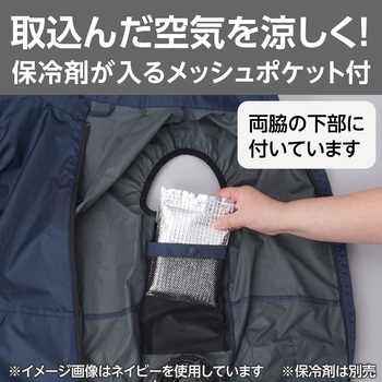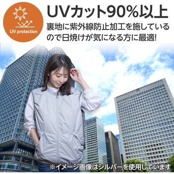 裏地にACグレーコーティングを施し、UVカット90%以上の仕様で、日焼けが気になる方に最適です。また、保冷剤をウェアに装着可能。取り込んだ空気を冷やすことで暑い夏場をより快適に過ごすことができます。風量3段切替。お好みの風量に調節可能で、運転時間は(強)約6時間、(中)約8時間、(弱)約11時間で、バッテリーは手差しポケットに入れて、手元でスイッチ操作ができます。
