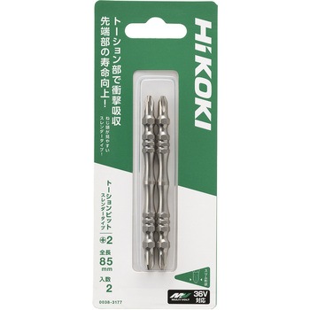 プラスビット 0038-3177長さ 85mm2本入り形状 トーション(スレンダー)軸にくびれがあり、締付時の衝撃を吸収します。細く加工された先端により、ねじ頭が見やすい形状です。狭い場所や視認性が必要な作業に向いています。マグネット入り