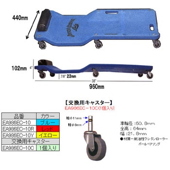 耐油性キャスター(ウレタン)。キャスターはすべて自在タイプです。体によくフィットするデザイン。キャスターは、EA986EC-44(車輪径:100mm)も取替可能です。通常より50mmほど長くいかなる体形でもフィットします。溶剤やグリース、燃料物に強い表面で清掃しやすい。