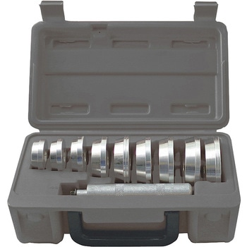 セット内容:リング9個 39.8mm(1.565”)・44.5mm(1.750”)・49.9mm(1.965”)・59.1mm(2.325”)・62.7mm(2.470”)・64.9mm(2.555”)・71.9mm(2.830”)・76.1mm(2.995”)・80.8mm(3.180”)、打ち込み用スリーブ165mm(1個)。テーパー側をベアリング溝に使用してください。