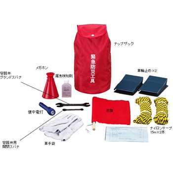 赤旗、メガホン、懐中電灯、ナップザック、革手袋、漏洩検知剤、ナイロンロープ:15m×2本、車輪止め(2個)、容器弁グランドスパナ: 21×23mm、容器弁用開閉スパナ: 6×10mm
