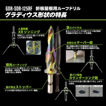 グラディウス形状で変わる、切れ味・操作性・仕上がり。【XRシンニング 4面研磨】材料にしっかりと食いつき安定した穴あけを実現。【お知らせテーパー段】音と振動の変化で作業進捗をお知らせ。【急スパイラル】急スパイラルアングル溝でスクイ角が鋭利で抜群の穴あけスピードを実現。【カウンターシンク段】ドリルを引き抜く際に裏バリをしっかりと除去。【ストッパー機能】抜け防止のストッパー機能付き。