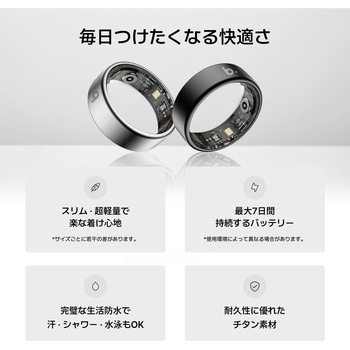 (2)どんなシーンにもマッチする洗練されたデザインと選べる2カラー。スタイリッシュでデイリースタイルに馴染む2色(ブラック、シルバー)。あなたの指先をより美しく完成させます。起きている時も、眠っている時も、一日中身につけても負担にならない快適さで、あなたの日常に自然に溶け込みます。