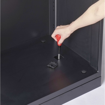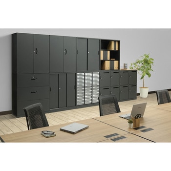 収納物のさまざまな用途に合わせた家具を奥行きサイズ450mmのブラック色に統一し、シック&モダンナオフィス空間を演出します。