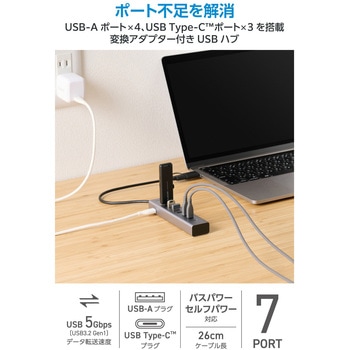 これ1台でポート不足を一気に解消!USB-AとUSB Type-C(TM)を合わせて7ポート搭載したUSBハブです。USB-AプラグをUSB Type-Cプラグに変換するアダプター付きで、機器を選ばず接続可能。バスパワー・セルフパワー両対応なので、充電器が不要な手軽さと安定した電源供給を両立します。