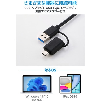USB-AプラグをUSB Type-Cプラグに変換するアダプター付きで、さまざまな機器に接続可能です。