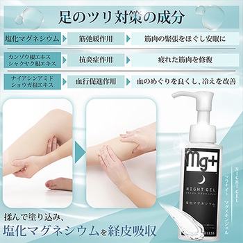 ツラナイトマグスキンジェルは就寝時や運動時に起こりやすい足のつりやこむら返りに着目した、経皮吸収型のマッサージジェルです。就寝前や運動前にふくらはぎを揉みながら塗布することで、塩化マグネシウムが筋肉の緊張を和らげます。カンゾウ根エキスとシャクヤク根エキスは疲れた筋肉に配慮し、ナイアシンアミドとショウガ根エキスは血行を促します。コンドロイチン硫酸Na配合で、肌のうるおいを保ちます。