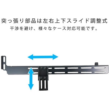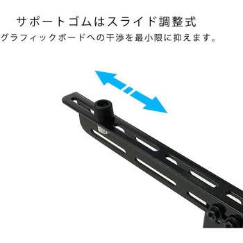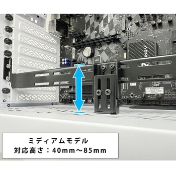 グラフィックボードの垂れ下がりや荷重による損傷を防止するPCI/PCI Expressスロット固定式のサポートステイの強化モデルになります。 突っ張り式で超重量級のグラフィックボードもガッチリと支えられます。 突っ張り式ミディアムタイプ:高さ40mm~85mmまで対応しています。 突っ張り位置はスライドで調整が可能ですのでケース底面にファンが設置してある場合でも極力干渉を避けることが可能です。 サポートゴムは可動式なのでグラフィックボードへの干渉を最小限に抑えて取り付けが可能です。 サポートゴムには耐久性と耐熱性が高いゴムを採用し歪みやぐらつきファンの微振動を効果的に抑えます。 剛性の高いスチールを使用し、曲げ加工を施す事で抜群の強度を実現しました。