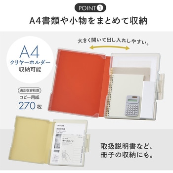 180°フルオープンでA4書類や小物をまとめて収納できる。