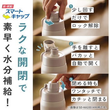 ラクに開け閉めできる「スマートキャップ」。少し回すとロックが解除され、手を離すと自動で開きます。閉めるときは押すだけ。少ない動作で素早く水分補給できる、新感覚のキャップです。