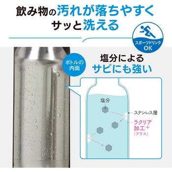 スポーツドリンクOK!耐食性が高くサビに強い「ラクリア加工+(プラス)」。汚れも落ちやすくサッと洗えてお手入れもカンタン。