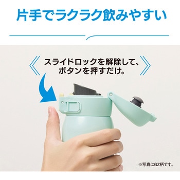片手でもサッと飲みすい。スライドロックを解除してボタンを押すだけ。しかも水滴が飛び散りにくい「飛び散り抑制機構」つき。