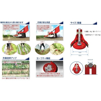 草刈り作業を「早く」 「楽に」 「安全」にお使いの草刈り機に取り付け簡単!(チップソー取付穴Φ25.4mmに適合)特殊トライアングルブレードが雑草を根元から取り除く角度付きの特殊刃だから楽な姿勢で作業効率大幅UP外刃がないので、作業中に作物を傷つける心配がありません3つの安全構造でけがの原因となる飛び石や土跳ねも防止