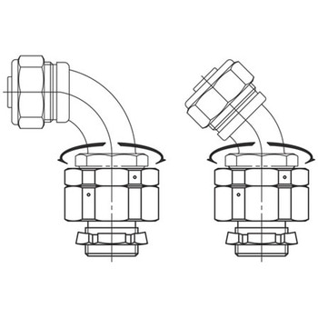回転機構のないコンネ端末に取り付け、回転コンネにするためのアダプタです。回転運動によるフレキのねじれを吸収し、破損を防ぐ効果があります。取付穴径の変更は必要ありません。電線保護のため、360°以上は回転しません。パネル取付時・フレキ接続時には、ストッパーピンに負荷が加わらないようにご注意ください。