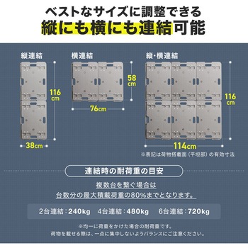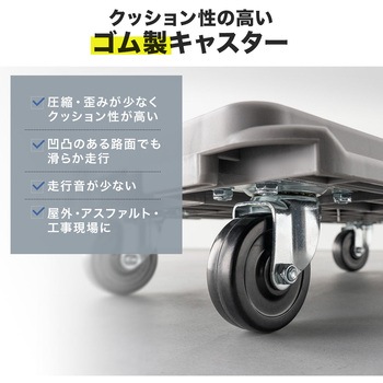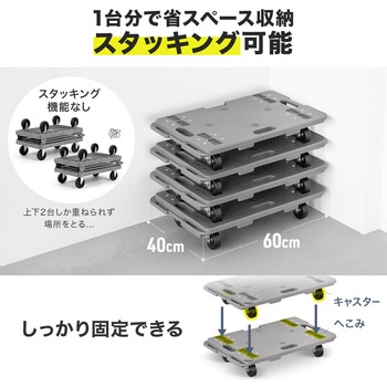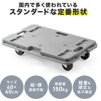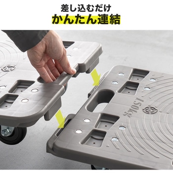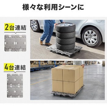 縦と横に連結可能でスタッキングもできる平台車です。荷台は高強度なPP素材で、積載荷重は約150KGまで対応します。台上に滑り止めも4か所付いており、ズレ落ちることも解消できます。ゴム製キャスターを使用しており、スムーズな動きと自由自在な動きをするキャスターです。重量は、約3.4KGと軽量なので、女性など力の弱い方でも持ち運びや作業がしやすいです。取っ手付きなので、片手で持ち運ぶこともできます。キャスターも交換することができる止めかたにしております。