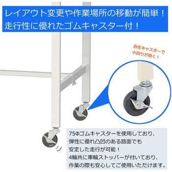 移動式の為、レイアウト変更や作業場所の移動が簡単に行えます。4輪自在のキャスター付きで小回り抜群です。