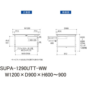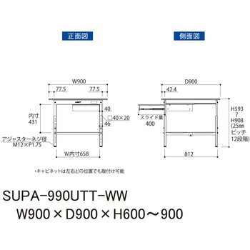 高さ600mm~高さ900mmタイプ:座り作業台・立ち作業台、どちらの用途にも使用できる高さ調整範囲。