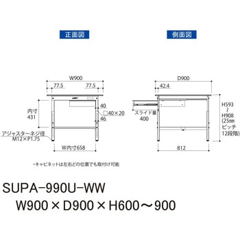 高さ600mm~高さ900mmタイプ:座り作業台・立ち作業台、どちらの用途にも使用できる高さ調整範囲。