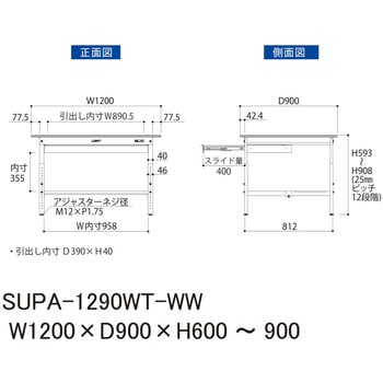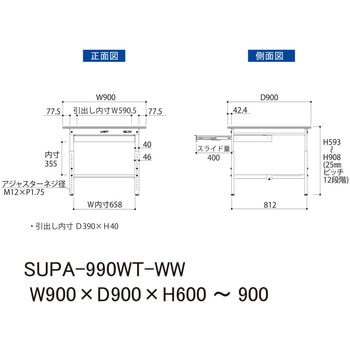 25mmピッチで高さ調整可能!シンプルで丈夫な使いやすい高さ調整式作業台です。長尺物の収納に便利なワイド引き出し付き。足元には半面棚付き。